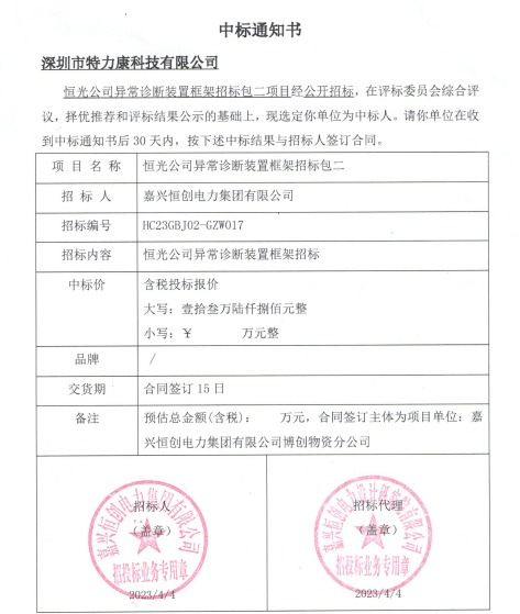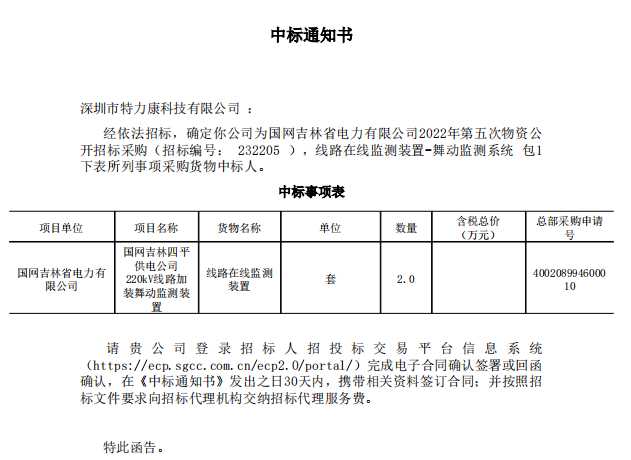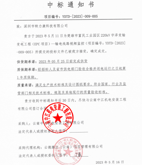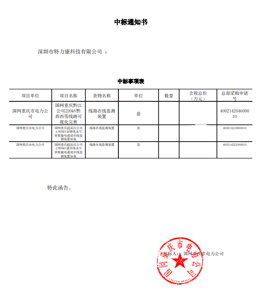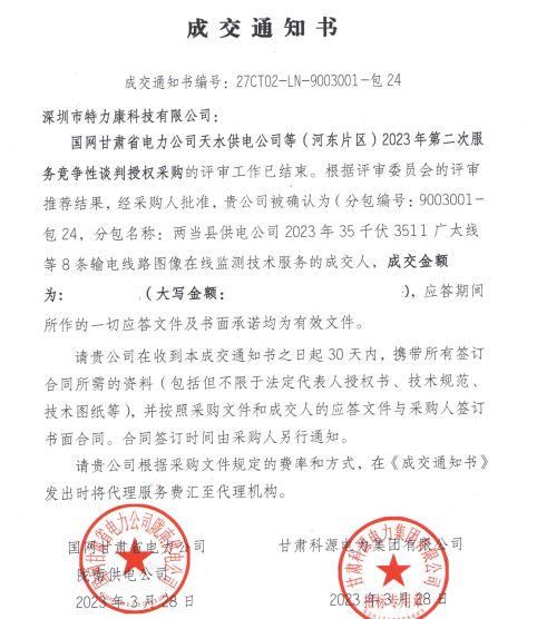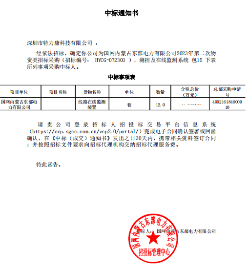 特力康中標(biāo)國網(wǎng)黑龍江送變電工程公司的2024年度第18次物資類競爭性談判采購項目——慶陽驅(qū)鳥器物資框 特力康中標(biāo)國網(wǎng)甘肅省電力公司省管產(chǎn)業(yè)單位2024年第五次物資競爭性談判授權(quán)采購項目 中標(biāo)喜訊:深圳市特力康科技有限公司成功入圍許繼集團(tuán)綜合能源公司輸電線路視頻在線監(jiān)測裝置模塊集采項目 中標(biāo)喜訊:特力康成功中標(biāo)國網(wǎng)重慶市電力公司渝中一片區(qū)項目 特力康成功中標(biāo)國網(wǎng)天津市電力公司2024年第二次?物?資招標(biāo)項目 特力康中標(biāo)國網(wǎng)安徽省電力有限公司蕪湖供電公司2024年3月非物質(zhì)采購項目 特力康輸電線路智能AI多目監(jiān)控裝置+傾斜監(jiān)測守護(hù)山西輸電生命線 鄂網(wǎng)“全景眼”:特力康一體化視頻監(jiān)控系統(tǒng)守護(hù)輸電線路 山東電網(wǎng) “穩(wěn)塔哨兵”:特力康智能桿塔傾斜監(jiān)測預(yù)警裝置筑牢電力桿塔安全防線 特力康科技輸電線路高清圖像監(jiān)控裝置,為河南輸電通道筑牢安全屏障 黃土高原護(hù)塔穩(wěn):特力康傾斜監(jiān)測裝置為山西電網(wǎng)筑牢根基 黔山冰防線:特力康 “數(shù)據(jù) + 圖像” 雙監(jiān)測守護(hù)貴州輸電線路 戈壁林區(qū)的 “火情哨兵”:特力康紅外熱成像裝置守護(hù)甘肅輸電線路 內(nèi)蒙電網(wǎng)裝上 “舞動監(jiān)測眼”:特力康輸電線路防舞動監(jiān)測系統(tǒng)守護(hù)線路安全 寧夏配電線路安裝了我司防外破電子化智能警示牌