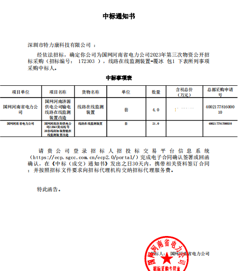 特力康中標(biāo)國網(wǎng)河南省電力公司2023年第三次物資公開招標(biāo)