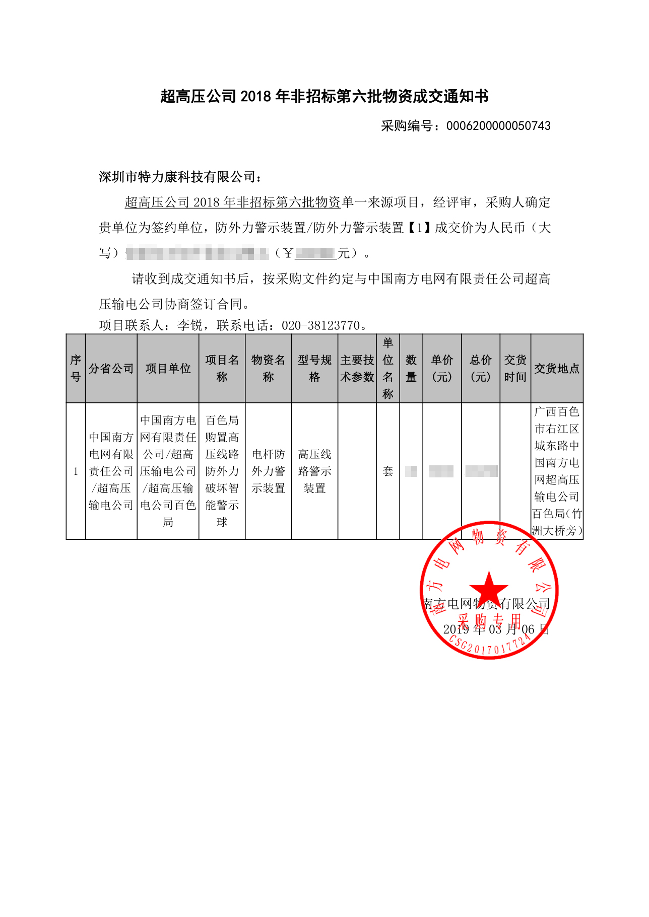 南方電網(wǎng)廣西百色超高壓局2018非招標(biāo)第六批物資評(píng)審工作已結(jié)束,經(jīng)評(píng)審委員會(huì)推薦,經(jīng)南網(wǎng)廣西供電公司電力公司招投標(biāo)領(lǐng)導(dǎo)小組批準(zhǔn),確定我司為廣西百色超高壓局2018非招標(biāo)第六批物資防外力警示裝置中標(biāo)單位。