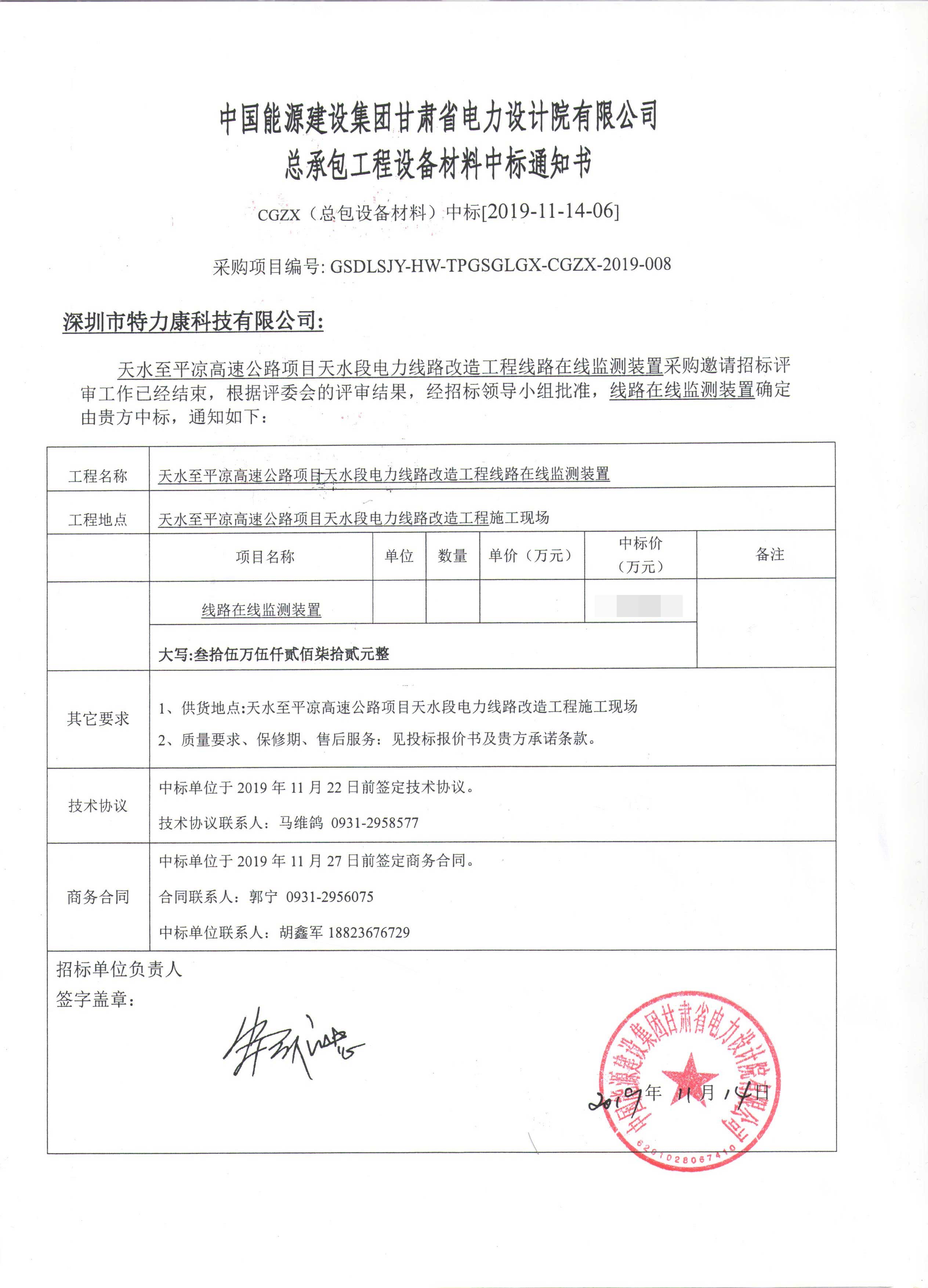 國網(wǎng)甘肅天水段電力線路改造工程線路在線監(jiān)測(cè)采購招標(biāo)評(píng)審工作已經(jīng)結(jié)束,根據(jù)評(píng)審委員會(huì)評(píng)審結(jié)果,招投標(biāo)領(lǐng)導(dǎo)小組批準(zhǔn),確定此次輸電線路在線監(jiān)測(cè)裝置由我司深圳市特力康科技有限公司中標(biāo),現(xiàn)將公告示下: