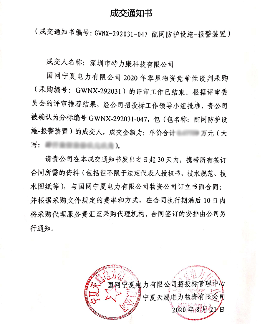 國網(wǎng)寧夏電力有限公司2020年零星物資競(jìng)爭(zhēng)性談判采購(采購編號(hào): GWNX-292031)的評(píng)審工作已結(jié)束。根據(jù)評(píng)審委員會(huì)的評(píng)審?fù)扑]結(jié)果,經(jīng)招投標(biāo)工作領(lǐng)導(dǎo)小組批準(zhǔn),我司(深圳市特力康科技有限公司)被確認(rèn)為分標(biāo)編號(hào)GWNX-292031-047,包(包名稱:配網(wǎng)防護(hù)設(shè)施-報(bào)警裝置)及分標(biāo)編號(hào)GWNX-292031-051,包(包名稱:技防系統(tǒng))的成交人,現(xiàn)發(fā)布成交通知書如下: