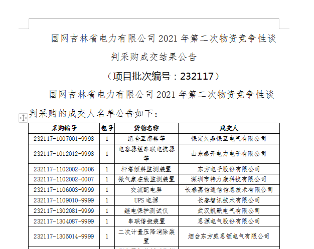 特力康中標(biāo)國網(wǎng)吉林省電力有限公司2021年第二次物資競爭性談判(項(xiàng)目批次編號: 232117)-微氣象在線監(jiān)測裝置,國網(wǎng)吉林省電力有限公司2021年第二次物資競爭性談判采購的成交人名單公告如下: